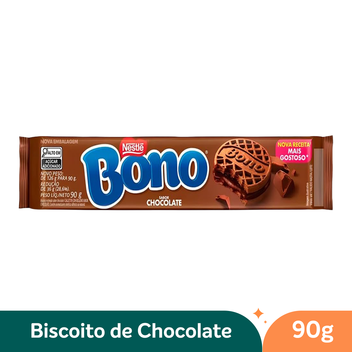 • Ingredientes principais: farinha de trigo enriquecida com ferro e ácido fólico, açúcar, gordura vegetal, chocolate em pó e aromatizantes