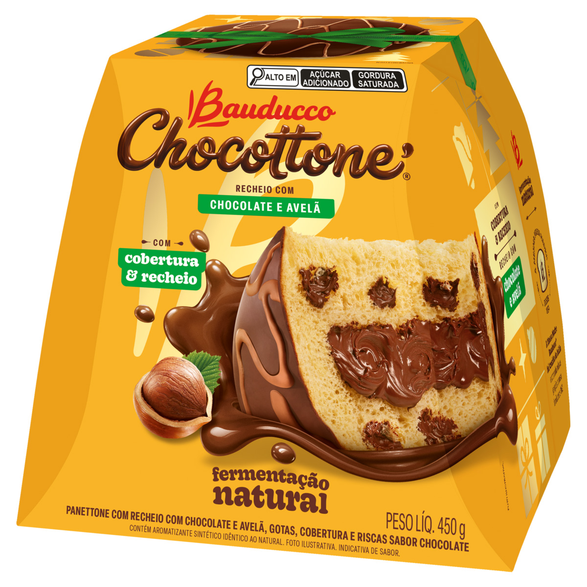 Composição: Panettone com recheio de chocolate e avelã, gotas de chocolate, cobertura e riscas sabor chocolate.